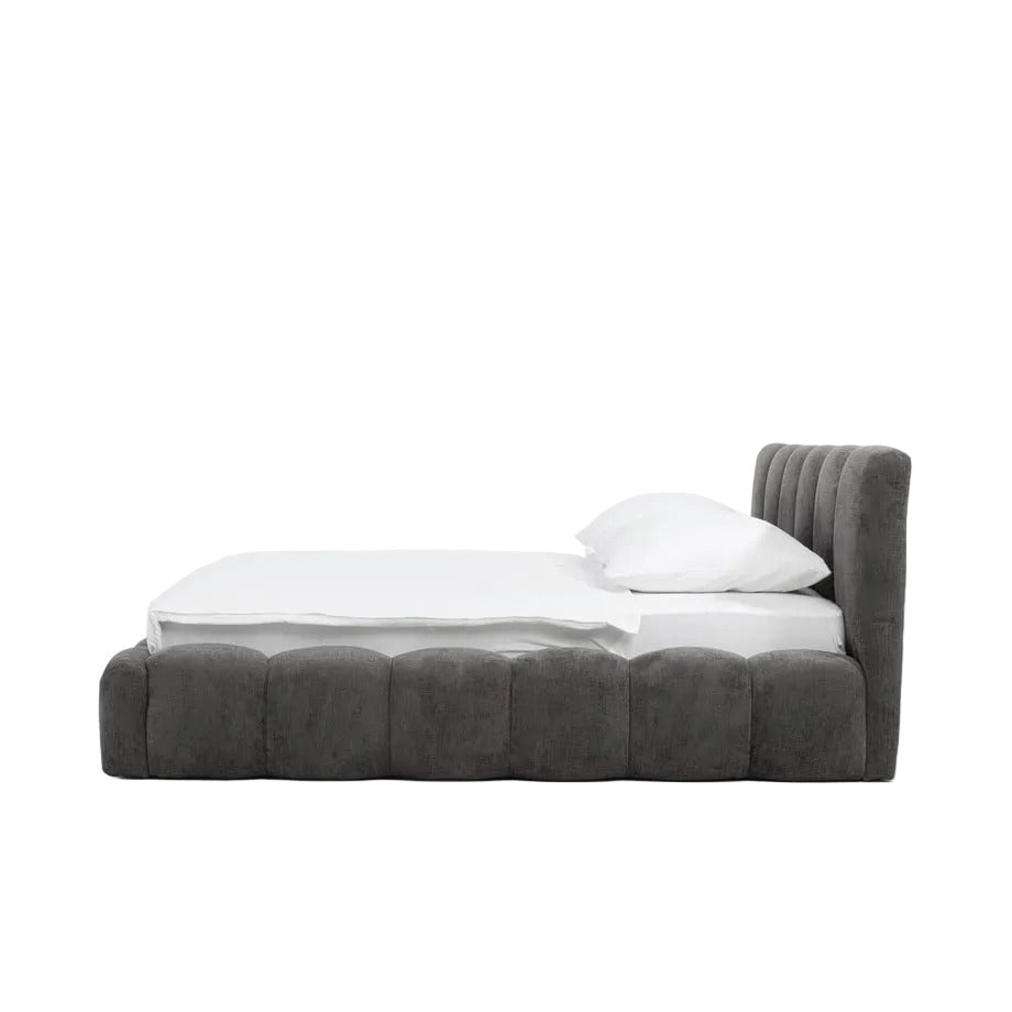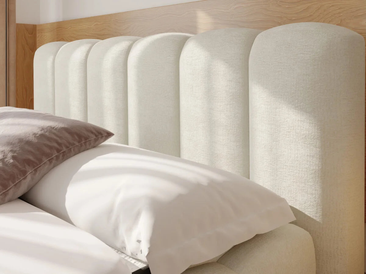 Gultas konstrukcija veidota ar platiem, polsterētiem segmentiem, kas piešķir tai apjomīgu un modernu izskatu. Audums ir maigs pieskārienam un rada mājīguma sajūtu. Galvgalis ir augsts un mīksts, nodrošinot ērtu atbalstu atpūtai.