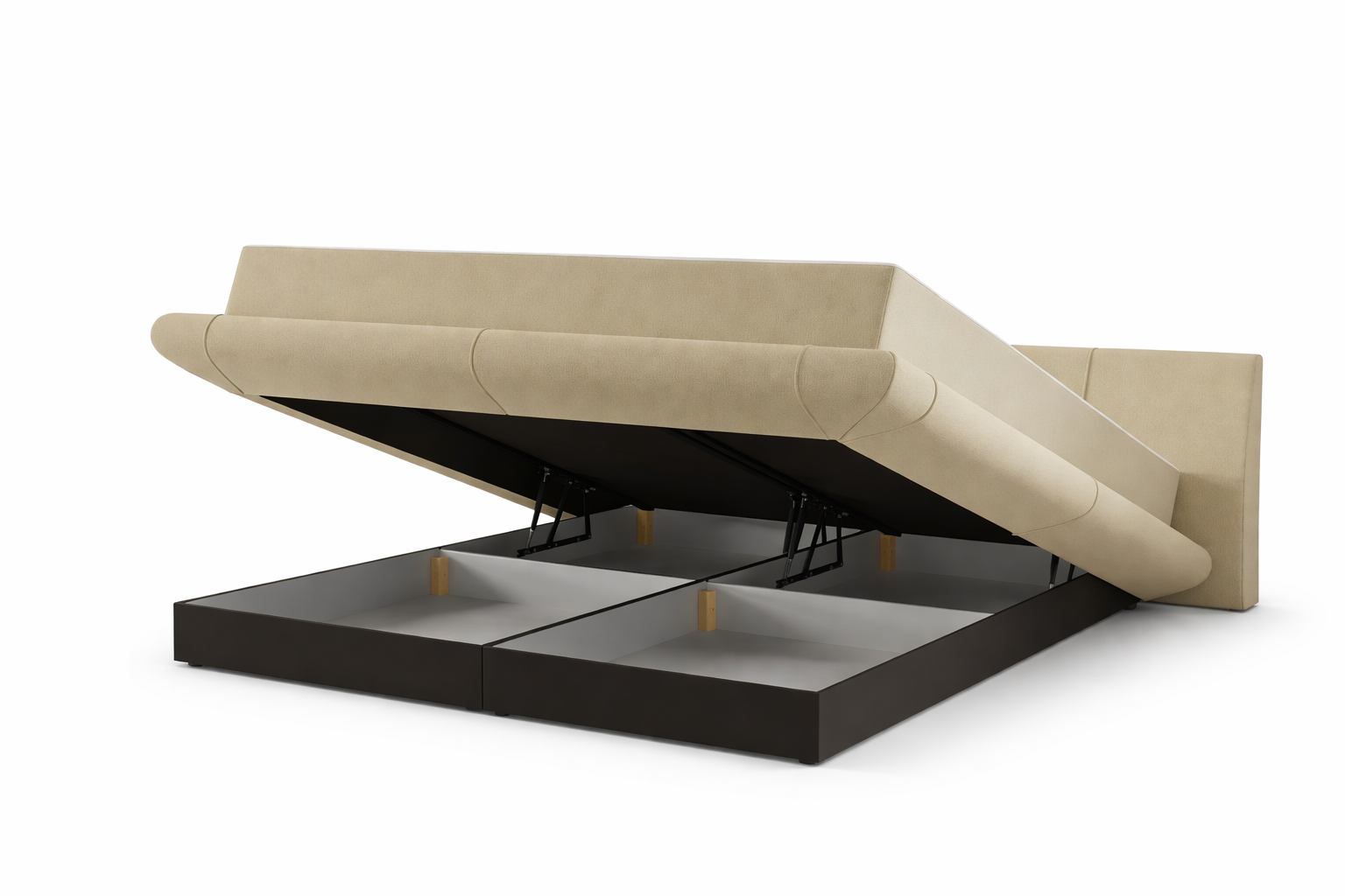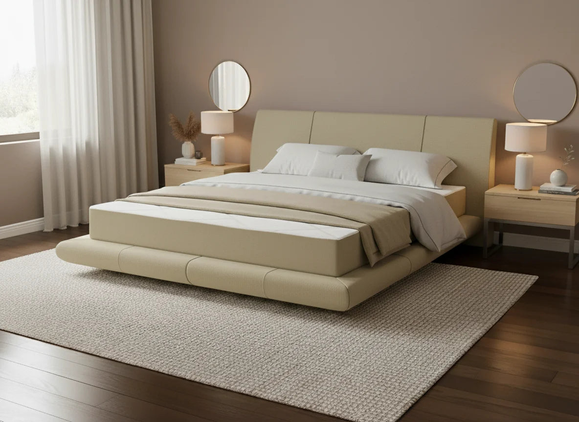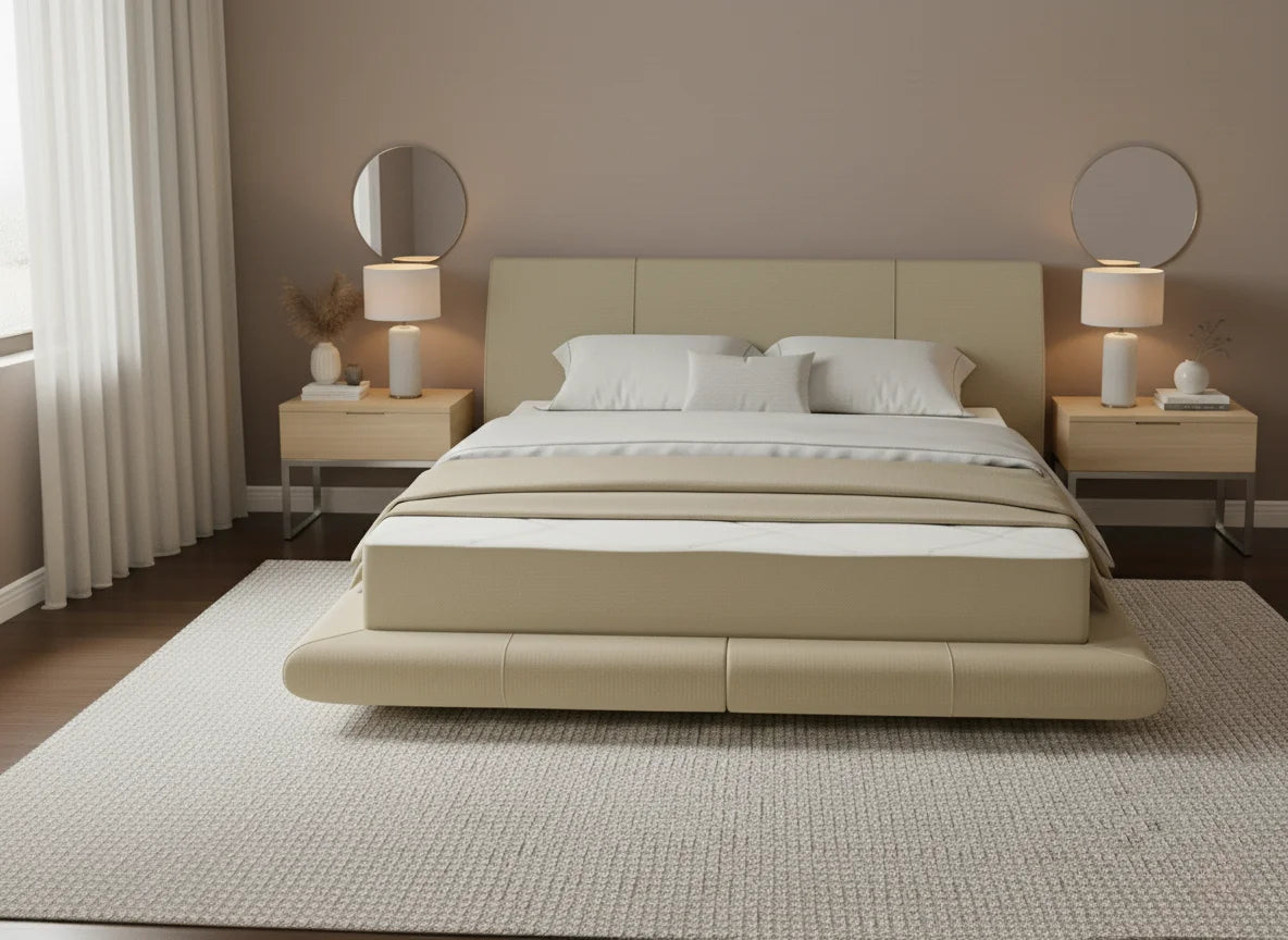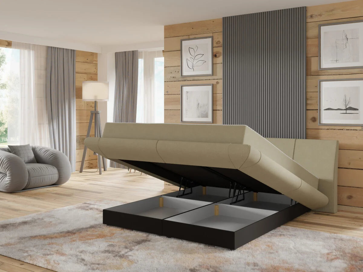 Moderna, zema profila gulta ar mīksti polsterētu rāmi un galvgali. Gultas konstrukcija rada vieglu, gaisīgu efektu, it kā tā paceltos virs grīdas vai viegli levitētu telpā. Tā izstaro modernu eleganci un rada sajūtu, ka interjers ir pārdomāts līdz pat mazākajai detaļai.
